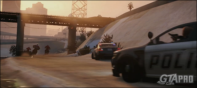 Nos 3 protagonistes ont la police aux trousses, roulant � tout allure dans la Los Angeles River, on aper�oit le policier conducteur tenant un pistolet dans sa main droite, tandis que celle de gauche tien le volant, visiblement les policiers pourront tirer en face d'eux en voiture, quitte � casser leur parebrise, l'IA � donc l'air d'avoir grandement �volu�e !
